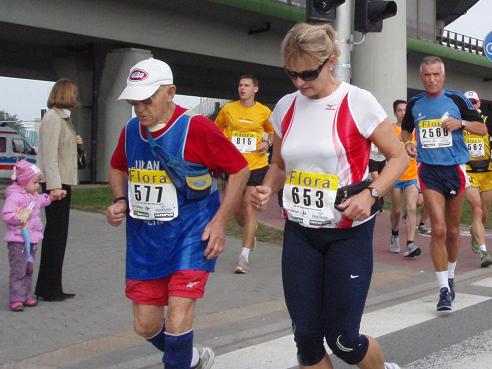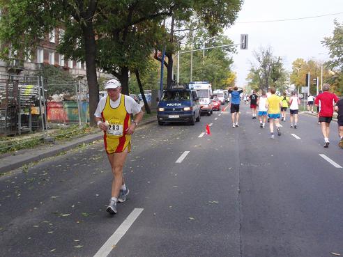 W. Witosa 11.24 Uhr / Kilometer 26,5 Links läuft Jan Niedzwiecki. Mit 82 Jahren der älteste Teilnehmer am 30. Warschau-Marathon. Langsam aber stetig lief er voran. 6:32:30 Stunden brauchte er bis ins Ziel. Meine Hochachtung. Gewundert hatte mich allerdings, wie er 26,5 Kilometer vor mir hat laufen können. Die Auflösung war: er war mit seiner Begleiterin schon um 7.30 Uhr gestartet. Ich hoffe, ich kann in dem Alter auch noch so laufen... |