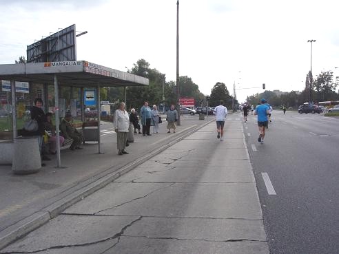 Sobieskiego 11.30 Uhr / Kilometer 27,5 Ob hier wirklich so bald ein Bus kommen wird? Man ließ zwar den Querverkehr bei Gelegenheit mal durch, die Laufstrecke selbst war aber frei von Autos und Bussen. Man hätte allerdings auch die Ratten auf Rädern (Radfahrer) mit entfernen sollen. Die rasten ständig wie geisteskrank durch das Feld und hätten mich mehr als einmal fast über den Haufen ge- fahren. Ein echtes Ärgernis, zumal einige wohl als Helfer für Läufer unterwegs waren und es hätten besser wissen sollen. |