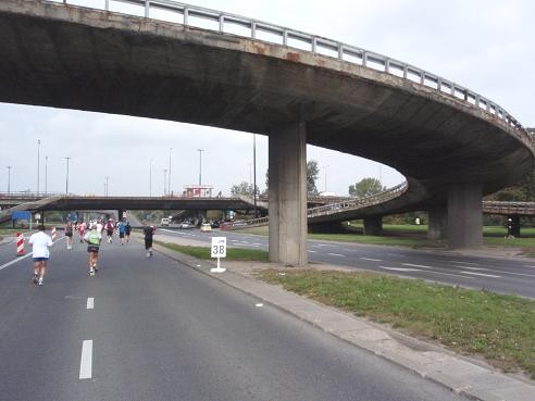 Solec 12.27 Uhr / Kilometer 38,0 Es war eine Besonderheit des Warschau-Marathons. Entlang des Kurses standen fast überall halb leere Isoflaschen. Die nahm man mit, trank ein wenig und dann stellte man sie wieder an den Straßenrand. Nun ging es unter der E30 durch. Von hier sind es direkt 542 Km bis zum Autobahndreieck Spreeau vor Berlin.