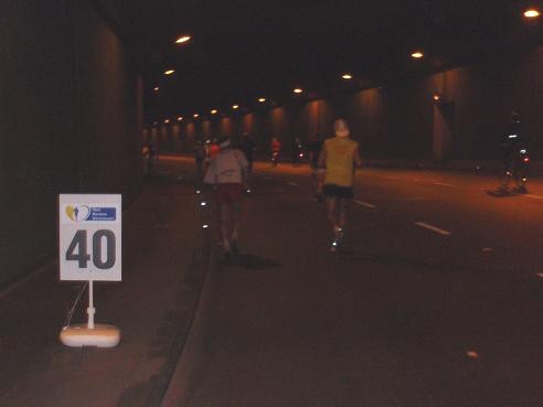 Wislostrada 12.37 Uhr / Kilometer 40,0 Rund 600 Meter ging es dann in den Tunnel. fTrotz anhaltender Probleme hielt ich ein flottes Durchschnittstempo aufrecht und konnte mir plötzlich Hoffnung auf eine Zeit unter 3:50 Stunden machen. Zu meinem Glück blieb der befürchtete Nord- wind weites gehend aus. Es war also ein faires Laufen nach Norden. |