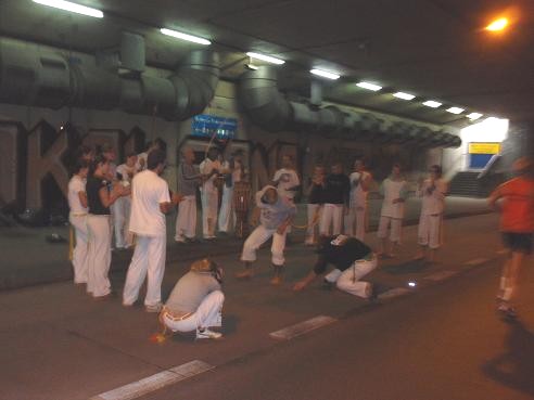 Wislostrada 12.39 Uhr / Kilometer 40,2 Die vierten 10 Km lief ich in 53:43 Minuten. Nur knapp langsamer als die 10 Km davor. Und hier im Tunnel begann ich noch einmal richtig aufzudrehen und legte an Tempo zu. Nun schielte ich auf eine Zeit mit 3:48 Stunden. Da blieb leider nur ein kurzer Blick auf die Tanz-Gruppe, die sich hier im Tunnel einen sehr ungewöhnlichen Ort ausgesucht hatte. |
