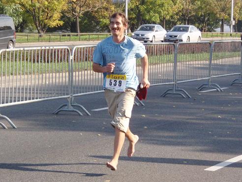 Gdynskie 14.41 Uhr Während ich noch an der Strecke ein paar Läufern applaudierte kam auch der Barfußläufer (siehe Bild oben bei Km 4,5) ins Ziel. Und das sehr leichtfüßig. Im wahrsten Sinne des Wortes. |