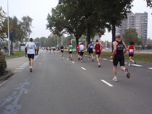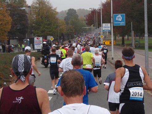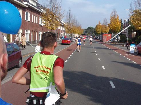 Stratumsedijk 12.23 Uhr / Kilometer 17 Und plötzlich war der grüne Ballon weg. Eben begrüßte er noch mal wieder einen Zuschauer und dann war es weg. Die ihm folgende Gruppe von rund 20 Läufern fiel sofort auseinander. Mit drei anderen Läufern zog ich aber das Tempo alleine weiter und kurz darauf hatten wir einen guten Vorsprung rausgelaufen. |