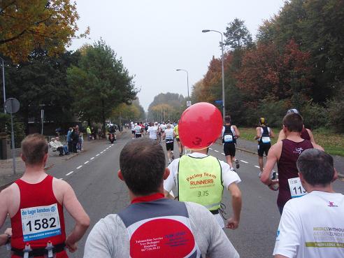 Orpheuslaan 11.14 Uhr / Kilometer 3 Die 3:30-Ballons waren an mir vorbei und zogen schnell davon. Das nur mal so als Intro für die noch folgende Ballon-Jagd. Bei mir lief es gut. Ungewöhnlich schnell hatte ich ein Tempo für mich gefunden und lief in 5:05 Min/Km über den Kurs. |
