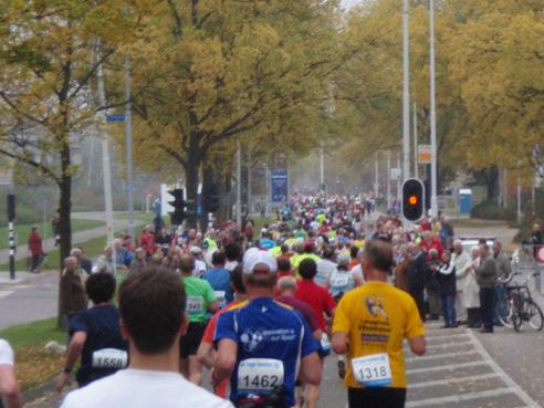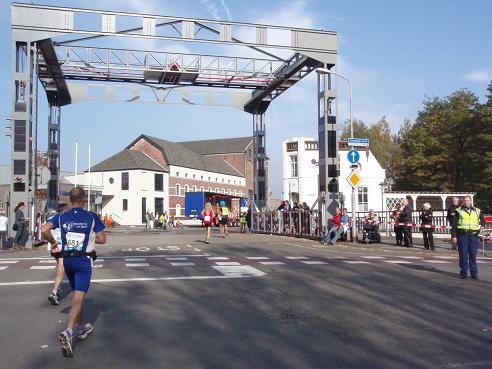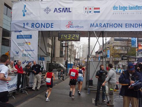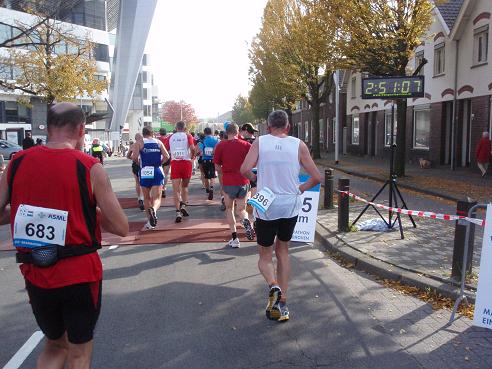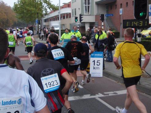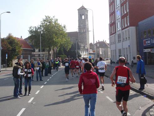 / Stadhuisplein 12.43 Uhr / Kilometer 21 Hier ist schon einmal das Ziel zu sehen. Der Halbmarathon kam dann ein paar Meter später. Da war ich bei 1:43:28 Stunden. Schon 92 Sekunden unter einer Zeit, die für eine Zeit unter 3:30 Stunden reichen würde. Ich wollte es mir noch gar nicht ausrechnen, aber ich war offenbar wieder mal auf der Jagd nach eine Rekord- verbesserung im zweistelligen Minutenbereich (der Rekord aus Oldenburg: 3:38:15 Stunden... fünf Wochen alt). |