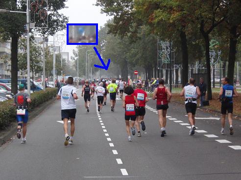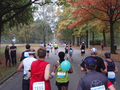 Montgomerylaan 12.51 Uhr / Kilometer 23 Nun kam der wohl entscheidende Moment meines Marathons. Auf der langen Geraden entdeckte ich in der Ferne einen blauen Ballon. Das mußte der offizielle 3:30er- Zeitläufer sein, der ganz zu Beginn an mir vorbei gerannt war. |