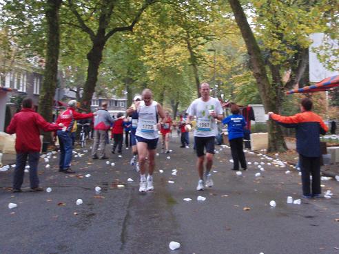 Stadhuisplein 14.30 Uhr Im Ziel fand ich auch den Ballon- Läufer wieder. Er war in 3:27:57 Stunden 35 Sekunden vor mir über die Ziellinie gelaufen. Für die tolle Hilfe war eine Danke-Schön eine Selbstverständlichkeit. Zu gerne hätte ich jetzt mehr als nur Wasser getrunken. Aber ohne Kleiderbeutelabgabe mußte ich erst einmal zurück zu meinen Freunden finden, die auf meine Sachen aufpaßten. Was machen eigentlich Leute, die ganz auf sich allein gestellt sind?? |