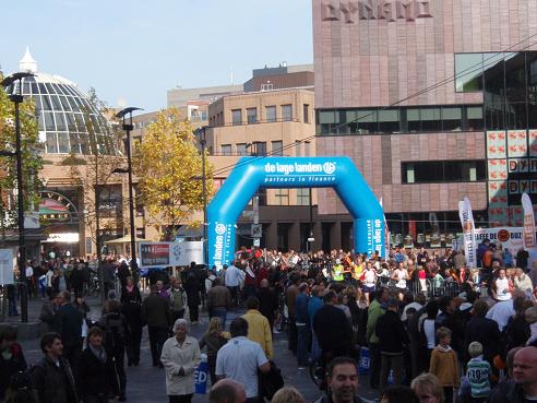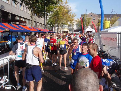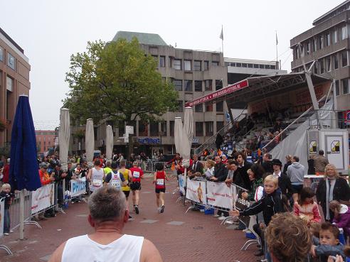 / Stadhuisplein 16.32 Uhr Nach einer längeren Bettpause ging ich dann noch einmal zurück zum Ziel. Hier liefen inzwischen nur noch Halbmarathonläufer ein. Zielschluß für den Marathon war nach 5 Stunden (16.00 Uhr). Wie man die aus der Masse rausfand weiß ich nicht. Schön aber zu sehen, daß hier im Ziel die Stimmung bis zu einer Halbmarathonzeit von 3 Stunden sehr gut war. |