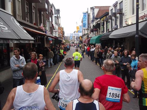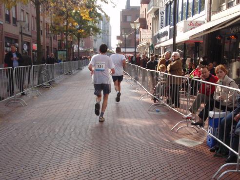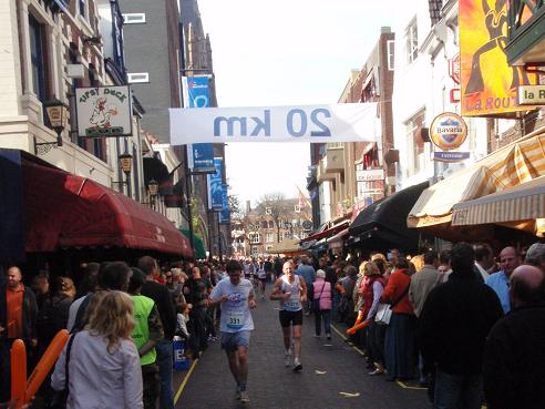 Nieuwstraat 14.21 Uhr / Kilometer 40,5 Endlich wieder die Innenstadt. Jetzt doch nur noch einmal quer durch und die Schleife südlich und ein kleines Stück Zielgerade. Meine Hoffnungen lagen jetzt auf der Stimmung, die mich zumindest durch die Innenstadt tragen sollte. Viele Zuschauer warteten auch schon auf die Halbmarathon- Spitze, die für 15.00 Uhr erwartet wurde. |