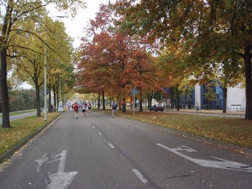 Montgomerylaan 11.06 Uhr / Kilometer 1 Bei kühler Witterung ging es flott los. Ich lief anders als noch in Warschau in kurzer Hose. Es wurde ja auch noch wärmer. Eindhoven hat übrigens einen Kurs von 21,2 Kilometern, den man fast zweimal durchlaufen muß. Die Halbmarathonläufer starten drei Stunden später, rennen also das Marathon-Feld am Ende über den Haufen. |