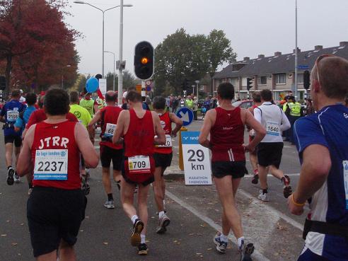 Bekkerslaan / Roelantlaan 13.21 Uhr / Kilometer 29 Nach sieben Kilometern Jagd hatte ich es tatsächlich geschafft. Ich hatte den 3:30er-Zeitläufer von hinten kommend eingeholt. Das war jetzt schon mehr als nur Wahnsinn, zumal ich mir jedem Kilometer, den ich so mit 4:45 bis 4:50 Min/Km rannte ja immer mehr Puffer auf den notwendigen Schnitt für eine Zeit unter 3:30 Stunden (4:58 Min/Km) aufbaute. |