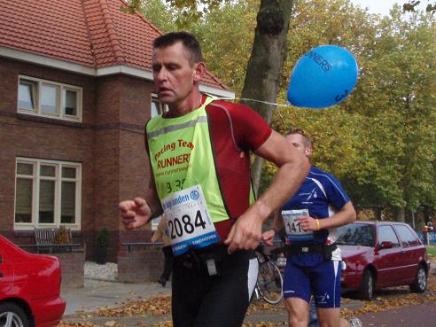 Catslaan 13.59 Uhr / Kilometer 36,5 Zu meiner Überraschung verlor ich den Ballon nicht aus den Augen. Immer war er so 30 bis 40 Meter vor mir. Die Laufgruppe hatte sich weitgehend aufgelöst. Die Masse war nach vorne los gelaufen, ein kleiner Rest lief noch beim Ballon und ich noch hinterher. |