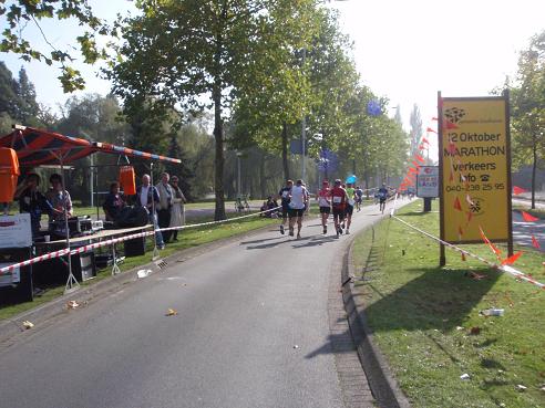 Parklaan 12.31 Uhr / Kilometer 18,5 Kurz danach hatte sich auch die Vierergruppe aufgelöst. Nun lief ich zwar mehr oder weniger mein eigenes Rennen, aber ich lief weiter sehr schnell. Erschreckend schnell sogar. 4:45 Min/Km lief ich über den Asphalt. Hier einer der acht Verpflegungs- stände (gut alle 2,5 Km einer). Angebot war ok. Wasser immer, Iso und Obst alle 5 Km). |