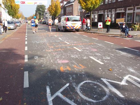 Stratumseindijk 12.38 Uhr / Kilometer 20 Dicht an dicht drängten sich die Leute hier an den Kneipen. Und ließen sich alle von der gelben Linie davon abhalten, auf die Strecke zu laufen. Das nenne ich diszipliniert. |