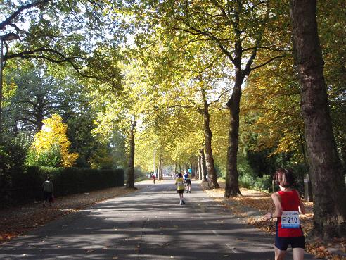 Parklaan 14.16 Uhr / Kilometer 39,5 Golden schimmerten die Bäume in der Mittagssonne. Angenehm warm war es geworden, aber nicht zu warm. Der Ballon war wieder 40 Meter weg. Die Hoffnung, sich mitziehen zu lassen, hielt nur 300 Meter an. Dann war mein Akku alle. Jetzt war es wirklich ein Kampf nur noch gegen den Krampf und die Zeit. Die Muskeln schrieen laut und ich hoffte nur noch, irgendwie heil ins Ziel zu kommen. |