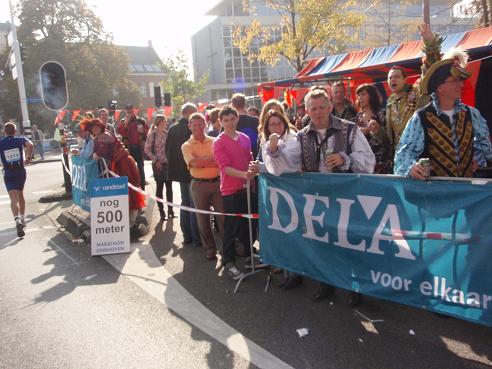 Stratumseindijk 14.23 Uhr / Kilometer 41 Es war schon unglaublich, was da am Rand für eine Stimmung war. Band an Band, Mensch an Mensch und alle hatten Bier. Naja... immerhin genug, um dabei neidisch zu werden. :-) Von Kilometer 41 aus hatte ich noch sieben Minuten Zeit, ins Ziel zu kommen. wenn doch nur das "Noch 500 Meter"-Schild endlich mal käme. |