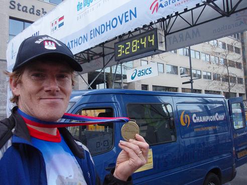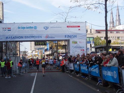 / Stadhuisplein 14.30 Uhr / Kilometer 42,195 3:28:44 Stunden für den Marathon von Eindhoven. Völlig am Ende torkelte ich durch den Zielraum auf der Suche nach meiner Medaille. Jetzt nur nicht lange an einem Platz stehen bleiben war jetzt das Motto. Das hätte mein Kreislauf dann mit Stillstand quittiert. |
