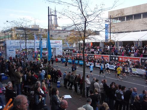 / Tramstraat 10.08 Uhr Per Zufall traf ich auf diesen Fun- Lauf von einem der vielen Co- Sponsoren des Marathons. Es gab überhaupt endlos Nebenläufe von 3 Km über Marathon-Staffel bis zum Halbmarathon. Da es klingt es auf der Homepage toll, wenn es 17.000 Starter beim Marathon geben soll. Tatsächlich waren es aber "nur" 1710 Marathonies. Dazu 6481 Halbmarathon-Läufer, 2313 6-Km-Läufer und 240 Läufer in 60 Marathon-Staffeln. |