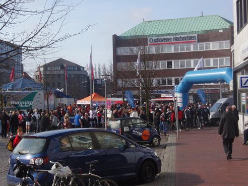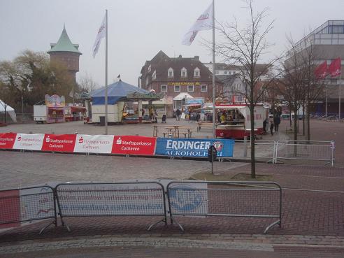 Kaemmererplatz 17.10 Uhr Kühl und windig präsentierte sich Cuxhaven an diesem Samstag. Am Freitag waren es noch sonnige 22°C gewesen, nun 14°C. Hier würde 18 Stunden später der Marathon starten. Der Wetter- bericht kündigte 9-11°C, Nord- oder Nordwest-Wind um 4 an. |