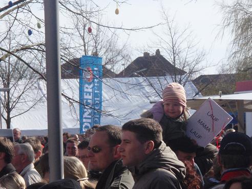 Wolfburg - Bayern München 5:1. Netter Ergebnis, gerade noch im Radio gehört, welches das Auf- bauteam bei sich hatte. Startunterlagen gab es dieses Mal beim Hauptsponsor selbst. Wie in den Vorjahren lief alles bestens. Und diesmal versprach man auch keine Marathon-Messe mehr, die dann eh nicht stattfand. |