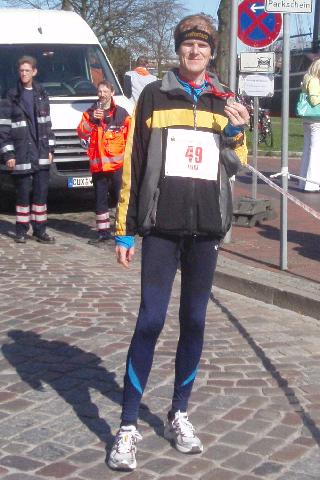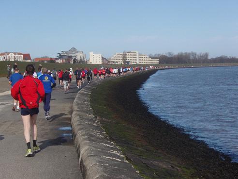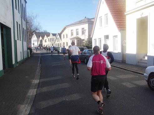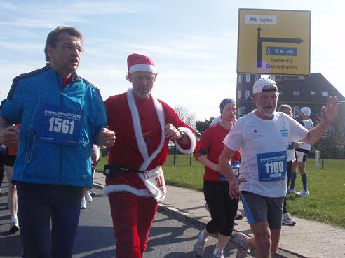 Prominenter Besuch in Cuxhaven. Der Nikolaus (Dieter Fromme) war mit dabei und auch Christian Korsch (Nr. 1160). Die Strecke war gegenüber 2008 unverändert. Vier Runden zu je 10,55 Km. Vom Stadtzentrum zum Hafen, Grimmershörnbucht, am Wasser bis zum Strandhaus Döse, über den Deich und dann hinterm Deich mit einem Schlenker im Lotsenviertel zurück. |