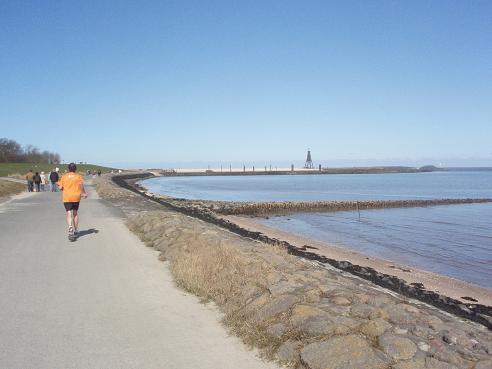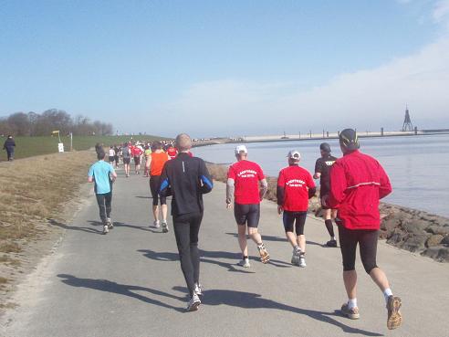Seedeich, 11.41 Uhr Kilometer 7,5 Nach etwas holprigem Start hatte ich mein tempo gefunden und lief ungefähr 5:15 Min/Km. Hier auf der Rückseite des Deiches an der Grimmershörn- bucht war es sehr windgeschützt und damit sehr warm. Nun wären kurze Klamotten ideal gewesen. Mit denen hätte man sich auf der Seeseite aber tot gefroren. Naja, ich hätte mich... |