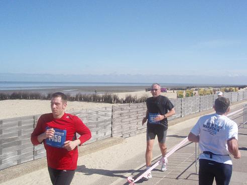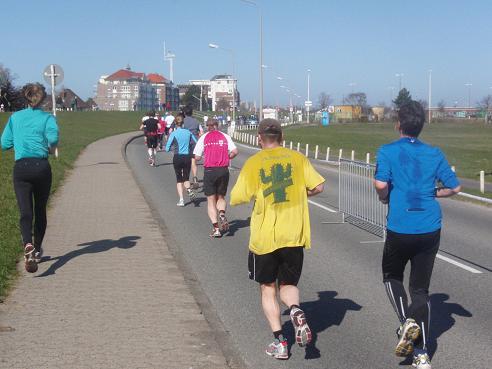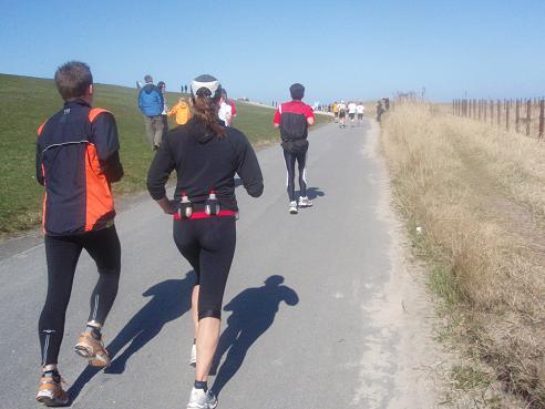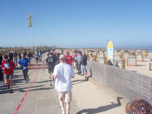 12.24 Uhr Kilometer 16 Vorne die Läufer, dahinter Sand und dann die weite Nordsee. Das lud zum Baden ein. Aber das Wasser war bestimmt noch kalt. |