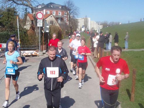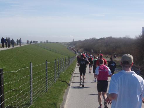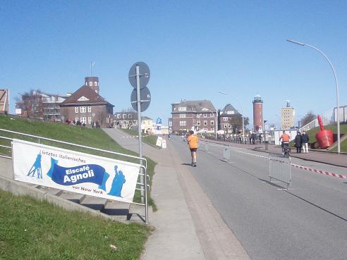 Seedeich, 11.30 Uhr Kilometer 5,5 Vor allem der lange Weg runter vom Deich. da half dann nur, Tempo rauszunehmen. Da zog dann jeder an mir vorbei, den ich kurz zuvor noch überholt hatte. Kaum unten angekommen, legte ich wieder an Tempo zu. |
