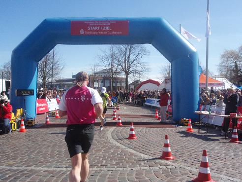 Wie in vielen anderen Städten ist auch in Cuxhaven der Marathon keine Solo-Veranstaltung. Vor dem Marathon starteten schon 79 Kinder über 2,5 Km, 83 Kinder über 5 Km und 317 Frauen und Männer über 10 Km. Hier im Foto der Zieleinlauf nach 10 Km. Im Hauptlauf starteten um 11 Uhr dann 505 Halbmarathonies und 152 Marathonläufer zusammen. |