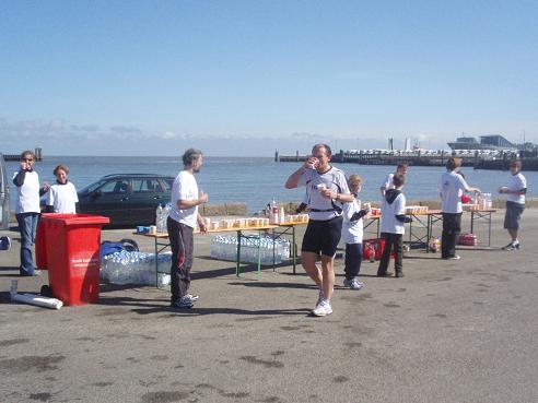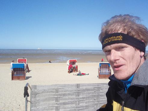 14.10 Uhr Kilometer 36 "Laufen wo andere Leute Urlaub machen" ist das Motto des Cux- haven-Marathons. Das paßt. Hinter mir am Strand sonnten sich die Leute im Strandkorb und ich plagte mich nun schon das vierte Mal hier durch. |