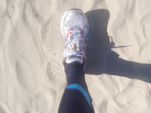 13.17 Uhr Kilometer 26 Wirklich im Sand läuft man nie. Aber auf dem Weg am Strand gibt es immer wieder Sand auf der Strecke. Und wenn man da mal von der Ideallinie anweichen muß, kommt man schon auf etwas unsicheren Untergrund. Wenn man aber etwas aufpaßt, ist das kein Problem. |