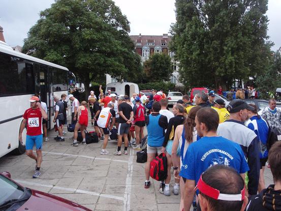 Im spät-freitaglichen Tiefschlaf hatte ich die Sicherheitsnadeln vergessen und musste noch einmal rasch ins Organisationsbüro. Dabei sah ich dann, dass die Busse nicht am Stadion, sondern 500 Meter weiter an der anderen Seite abfahren. Das wurde eng, hat aber geklappt. |