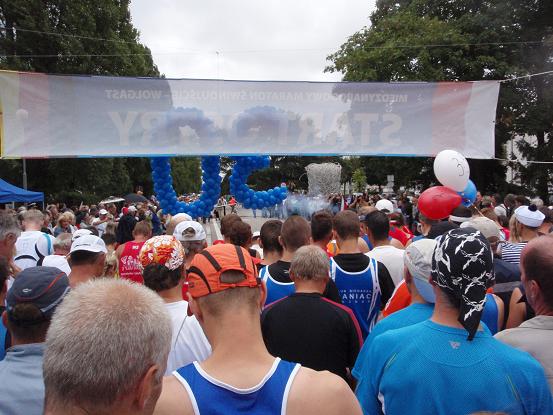 Also meiner Tochter hätte die Masse der verbrauchten Ballons gefallen. Hier ein selbsternannter 3:59-Stunden Läufer. Bis zum Start zog sich die Zeit. Endlos redeten Organisatoren und Politiker und alles wurde übersetzt. Die Polen erinnerten an alle möglichen vor mehr oder minder langer Zeit Verstorbener Ex-Läufer und für den deutschen Teil taten sich drei Wochen vor der Bundestagswahl die Lokalpolitiker hervor. Und wir standen und froren. |