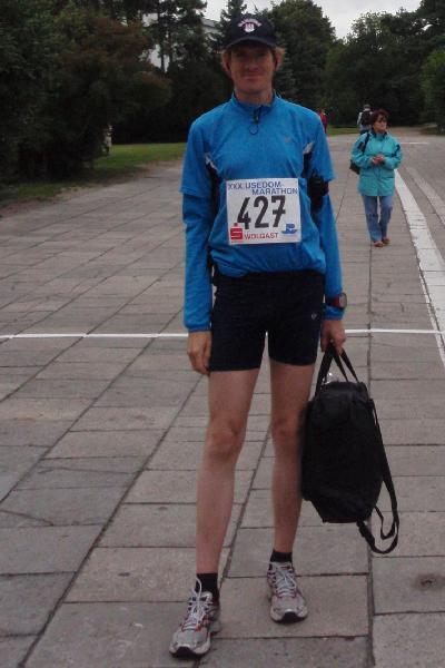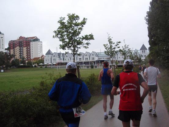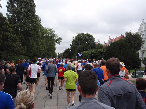 Der Start war auf der Uferpromenade. Die Ostsee konnte man aber leider nicht sehen. Überhaupt war das Wasser nur sehr selten zu sehen. Also das Wasser der Ostsee... der Himmel sonst versprach nichts Gutes. Es wehte ein scharfer und kalter Wind aus Westen und leichten Regen gab es auch. Westwind war schlecht, denn der Punkt-zu-Punkt-Marathon von Swinoujscie nach Wolgast führt fast ausschließlich in westlicher Richtung. |