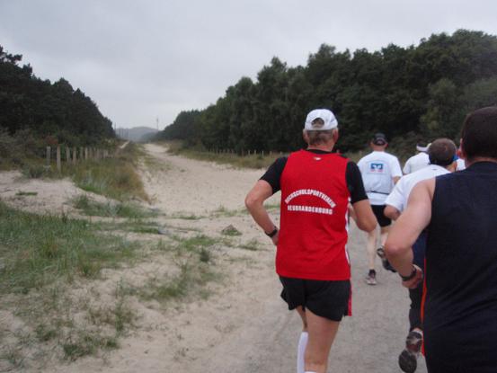 Zinnowitz Kilometer 30,5 / 13.13 Uhr Na Klasse.... erst die T-Shirts aus Kalisz und nun ging es auch noch durch Zinnowitz. Da wird einem ja echt was geboten (nur für Insider). Die ersten Kilometer ging es auf einem abgesperrten Streifen auf der Bundesstraße neben den Autos lang. Die stauten sich durch den ganzen Ort und kamen langsamer voran als wir Läufer. |
