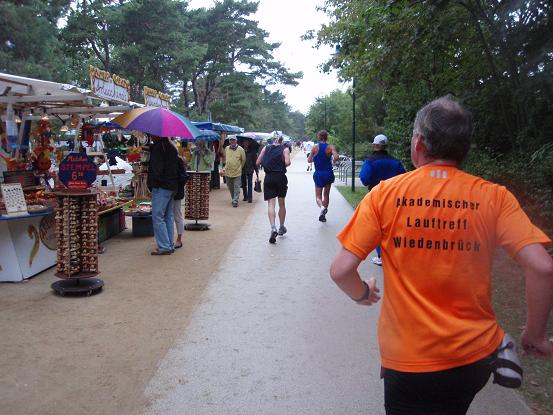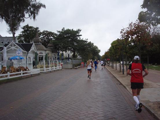 Ahlbeck Kilometer 6,5 / 11.11 Uhr Jetzt kam auch zum ersten Mal so richtig der Regen ins Spiel. Was die Touristen und Souvenirjäger links offenbar nur wenig störte, ging mir und einigen anderen Läufern rechts mächtig auf die Nerven. |