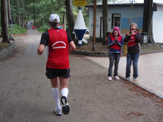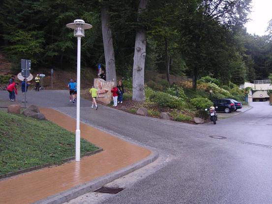 Bansin Kilometer 11,5 / 11.34 Uhr Und plötzlich war der Spaß vorbei. Erst ging es steil in den Ort hinein und dann hier steil in den Wald hinein. Schluß war es mit Uferpromenade. Nun begann der härtere Teil des Laufes. |
