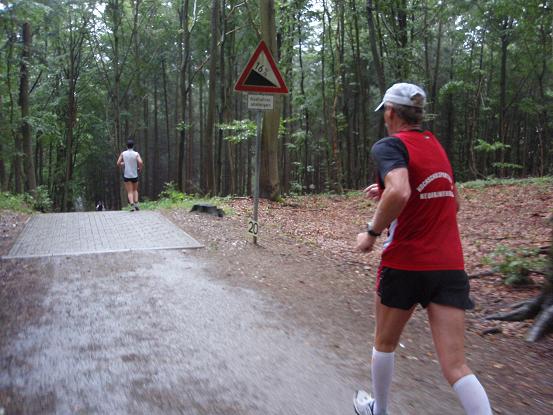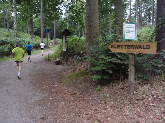Langenberg Kilometer 12 / 11.36 Uhr Ok, hätte man das Streckenprofil sorgfältiger studiert, dann wäre der 30 Meter-Hügel bei Kilometer 13 schon aufgefallen. Aber das alleine war es nicht. Statt stetig bergauf ging es Kilometer um Kilometer rauf und runter und irgendwann passierte der Kurs wohl auch die 30-Meter-Höhe. Das ging in die Knochen. Der Name "Kletterwald" war nicht so verkehrt. |