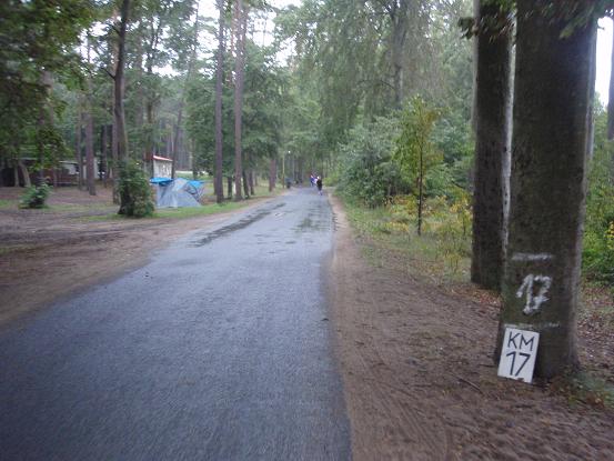 Wockninsee Kilometer 17 / 12.03 Uhr Als das heftigste Stück Wald vorbei war, kam ein endlos langes und lang- weiliges Stück Campingplatz. Das dauerte knapp 2,5 Kilometer. Zudem kam nun der erste richtig schwere Regenguß von oben. Das dauerte ein wenig, die Kameralinse wieder trocken zu kriegen.