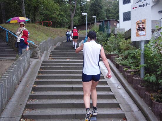 Kölpinsee Kilometer 22 / 12.28 Uhr Kurz nach dem Halbmarathon kam eine der vielen schönen Verpflegungs- stellen und gleich danach das hier. TREPPEN!! Also bei aller Liebe. Deswegen bin ich doch nicht an die angeblich so flache Küste gefahren. Den Halbmarathon passierte ich übrigens nach 1:49:07 Stunden. Also ganz im Trend unter 3:40 Stunden zu bleiben. |