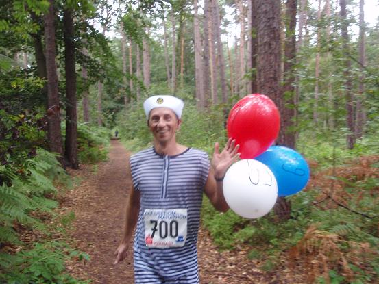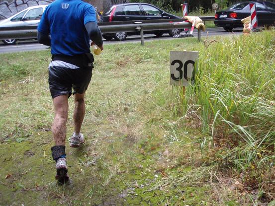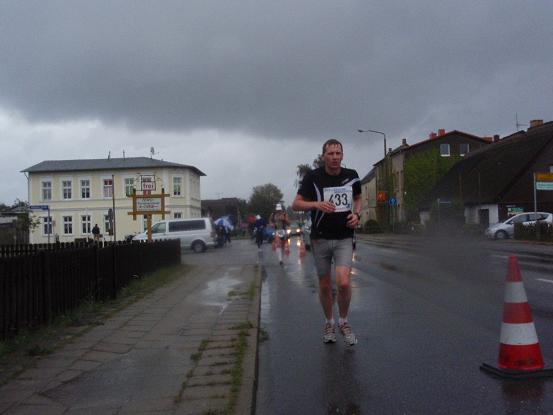 Zempin und Zinnowitz Kilometer 29,5 / 13.07 Uhr Auf einem tief durchweiten und schmalen Weg ging es durch den Wald. An dem meisten Stellen konnte man nicht einmal überholen, aber so viele Läufer waren ja auch nicht da. Der Läufer ist Piotr Andrzejewski aus Swinoujscie. Mit der 3:59-Zielzeit laut Ballons haperte es etwas. Hier lag er noch auf 3:39-Stunden-Kurs, finishte dann mit 3:50:32 Stunden. Ab Km 30 wurde es auch über mit den Ballons... |