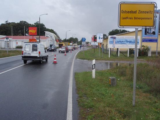 Zinnowitz Kilometer 31 / 13.16 Uhr Hier rechts war Flohmarkt. Arme Leute, fing es doch wieder an, heftig zu regnen. Dazu noch der scharfe und kühle Wind von vorne. Da waren sie nun, die angekündigten Sturmböen. Das war wie gegen die Wand zu rennen. |