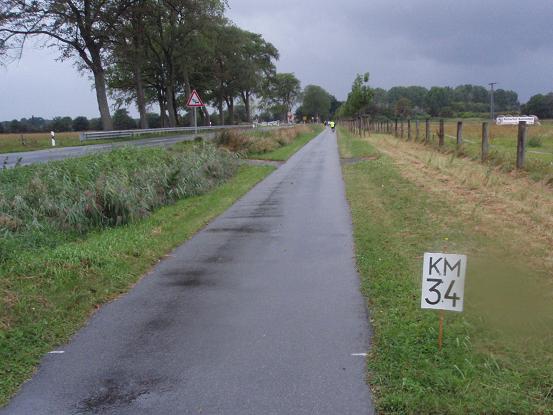 Bannemin Kilometer 35 / 13.39 Uhr Und weiter ging es. Nun öffnete der Himmel endgültig alle Pforten. Wind von vorne, Wasser von vorne. Warum war ich morgens eigentlich nicht im Bett geblieben? Nun... der Wille war stärker und naß war ich ja sowieso. Und wie immer wunderte es mich, daß die Technik da mitmachte. Der Foto- apparat und auch mein Garmin sind offiziell spritzwassergeschützt bzw. wasserdicht, aber z. B. mein mp3- Player sollte eigentlich kein Wasser abkriegen. Aber die Musik lief, auch wenn ich bei dem Wind am Ohr und dem Prasseln auf der Schirmmütze kaum noch etwas verstand. |