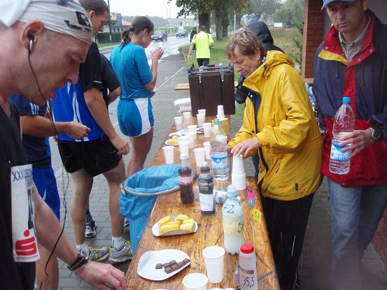 Bannemin Kilometer 35 / 13.38 Uhr Den vorletzten Verpflegungsstand erreichte ich gleichzeitig mit zwei Gruppen. Neun Stände gab es auf der Strecke. Und lecker. Wasser, Iso, Tee (teilweise auch warm), Saft, Obst, Schokolade, Traubenzucker. Die Coca-Cola war Selbstverpflegung und leider nicht für mich. |