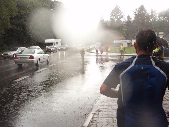 111 / Lindenallee Kilometer 36 / 13.44 Uhr Wasser, Wasser, Wasser. Die armen Streckenposten. Wir Läufer waren ja immerhin noch in Bewegung und von innen warm. Einige Tropfen taten richtiggehend auf der Haut weh. Egal. Ich wollte meine Medaille. Und ich wollte immer noch unter 3:40 Std. bleiben. Und noch war ich auf Kurs. |