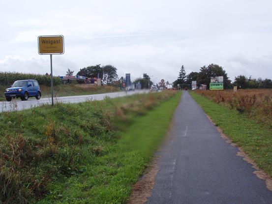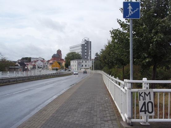 Wolgast Kilometer 38 / 13.54 Uhr Am Ortseingang von Wolgast war der Regen abgeebbt. Die Kamera hatte ich einigermaßen getrocknet und es gab auch wieder Bilder, auf denen was zu sehen war. Und die ganze Läufer- gruppe hatte ich überholt, als diese am leichten Anstieg vor Wolgast nicht mehr gegen den Wind ankamen. |