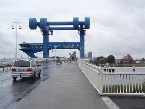 / Peenebrücke Kilometer 39,5 / 14.01 Uhr Mit der Peenebrücke endete der Lauf auf der Insel Usedom. Der Westteil von Wolgast liegt schon auf dem Festland. Die Brücke hinauf war eine schöne Plackerei zumal man den letzten Verpflegungsstand ausgerechnet in die Talsohle vor der Brücke platziert hatte. Sonst hätte man den Schwung vom kurzen Bergab-Lauf vor der Brücke mitnehmen können. |