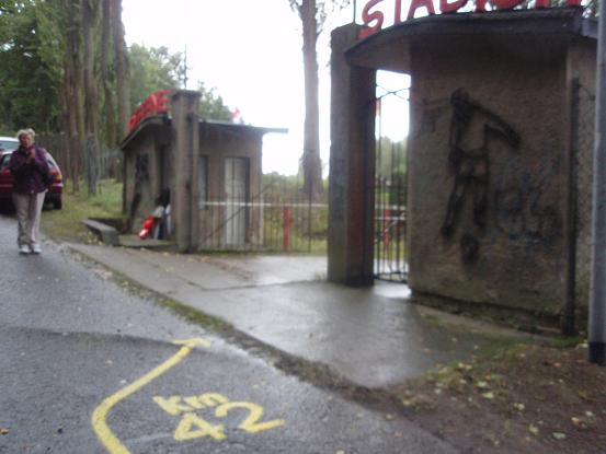Wolgast Kilometer 41,5. / 14.11 Uhr Fast sicher, denn in Wolgast ging es noch einige Male scharf hinauf und wieder hinunter, was ich aber in der Vorfreude auf das Ziel locker lief. Kurz vor dem Stadion dann noch dieser brutale 300 Meter steile Anstieg. Da mußte ich dann doch noch einmal Tempo rausnehmen. Da konnte ich dann doch nicht mehr raufsprinten. |