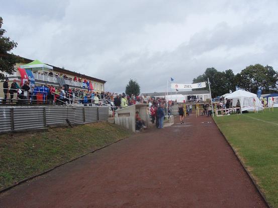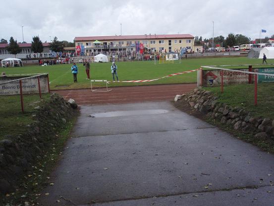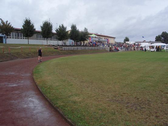 / Peene-Stadion Kilometer 42 / 14.12 Uhr Der Blick ins Stadion. Und endlich war es auch so etwas ähnliches wie trocken. Ich hüpfte trotzdem erst einmal freudig in die Pfütze. Ich hatte gedacht, es wäre die letzte, aber danach kam noch eine ziemlich überflutete Aschenbahn. |
