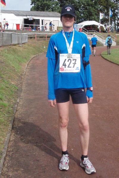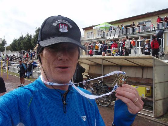 / Peene-Stadion Kilometer 42,195 / 14.14 Uhr GESCHAFFT !! Die Hügel konnten mich nicht aufhalten, der Wind nicht und der Regen auch nicht. Die 38. Medaille war meine. Die Endzeit: 3:37:47 Stunden. Damit war ich auf der zweiten Hälfte mit 1:48:40 Stunden noch 27 Sekunden schneller als auf der ersten Hälfte. Das reichte für Platz 69 von 249 Finishen. Und in der AK M40 für Platz 12 von 34 Finishern. |
